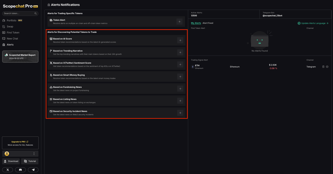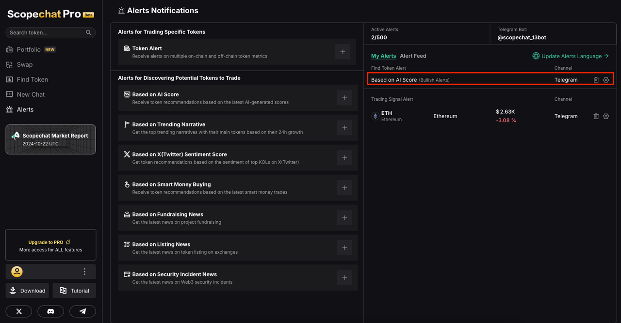 **1. AI Score Alert**. Receive token recommendations based on the latest AI-generated scores from Scopechat.