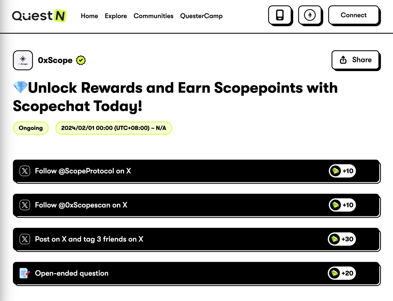 4. [Twitter Quest](https://docs.scopechat.ai/points-and-referrals/scopepoints-tasks#galxe-quest) (+2 Scopepoints)