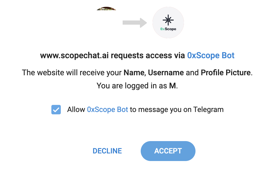 3\. You will be redirected to a prompt (see below) that notifies you about the 0xScope Bot that we use to check your membership status. Allow 0xScope bot to verify your Telegram membership by clicking/tapping the Accept button.