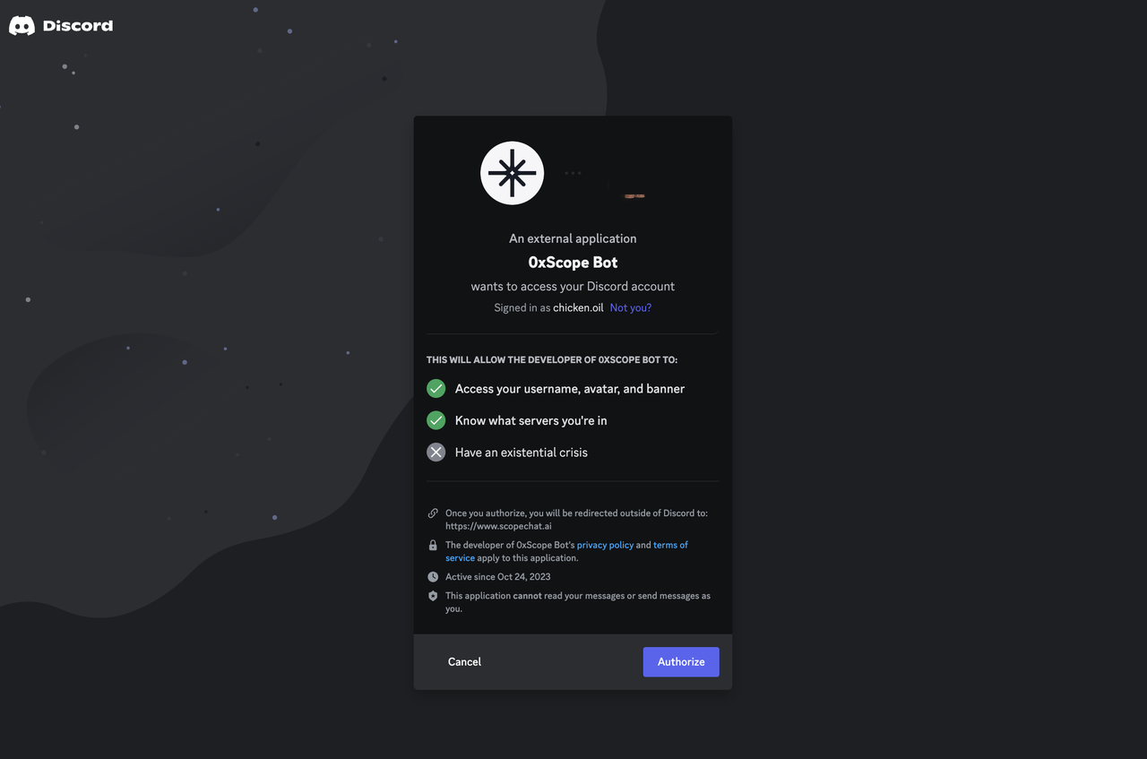3\. You will be redirected to the 0xScope bot screen. To complete the process, click/tap the Authorize button to allow the 0xScope bot to verify your Discord membership.