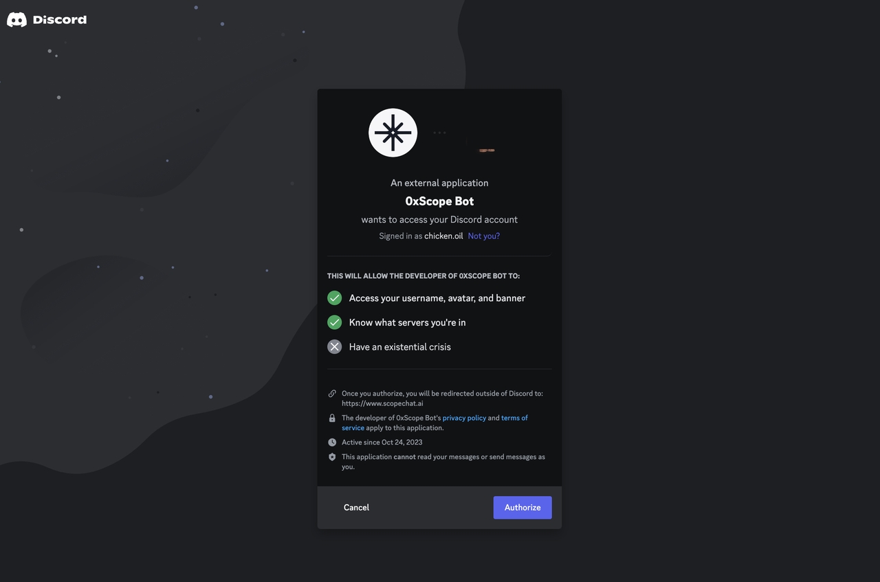 3. You will be redirected to the 0xScope bot screen. To complete the process, click/tap the Authorize button to allow the 0xScope bot to verify your Discord membership.