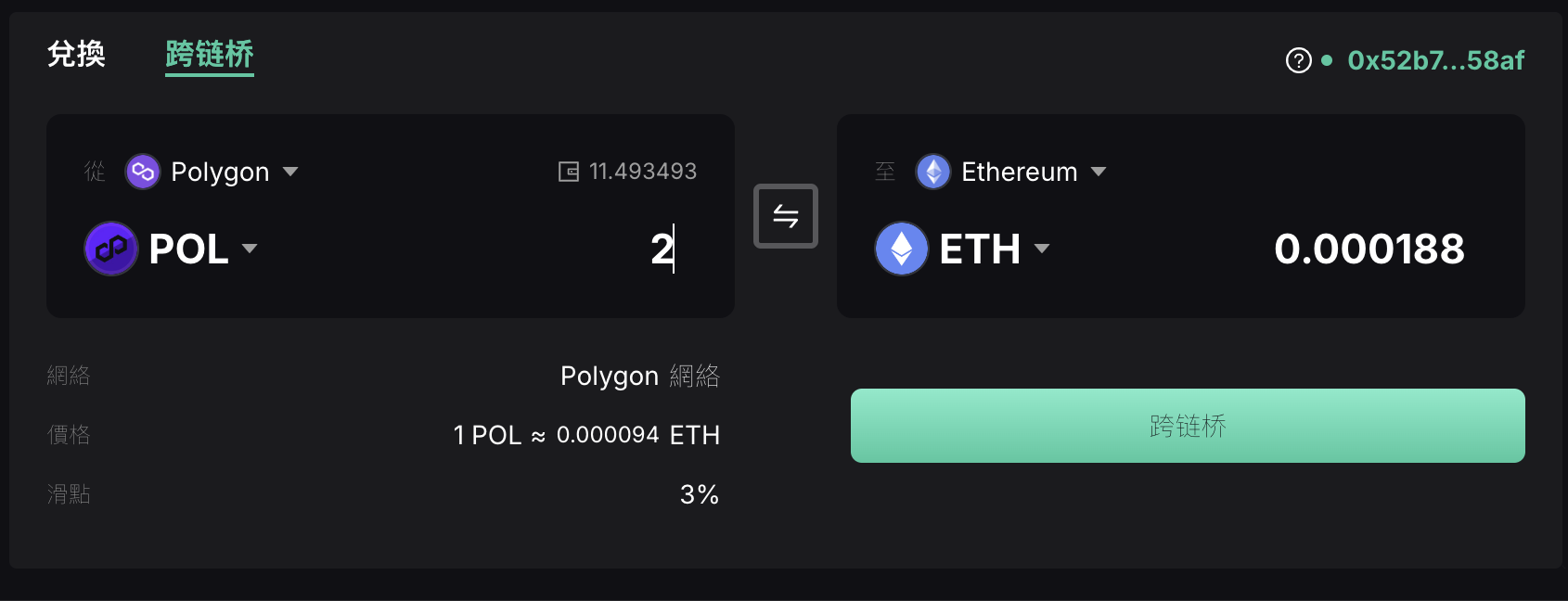 注意:和其他交換或跨鏈交易一樣,請確保您的錢包或交易地址中有足夠的代幣餘額來完成此次交易。