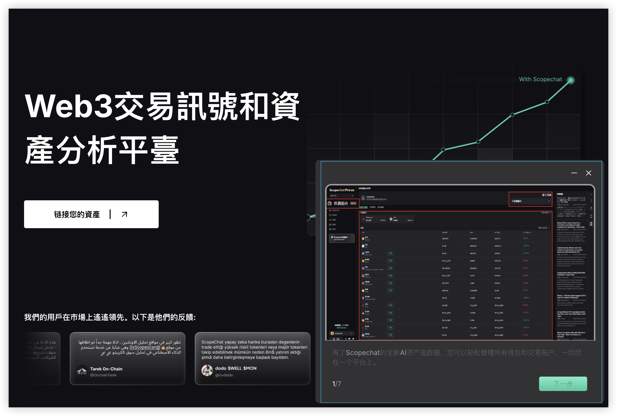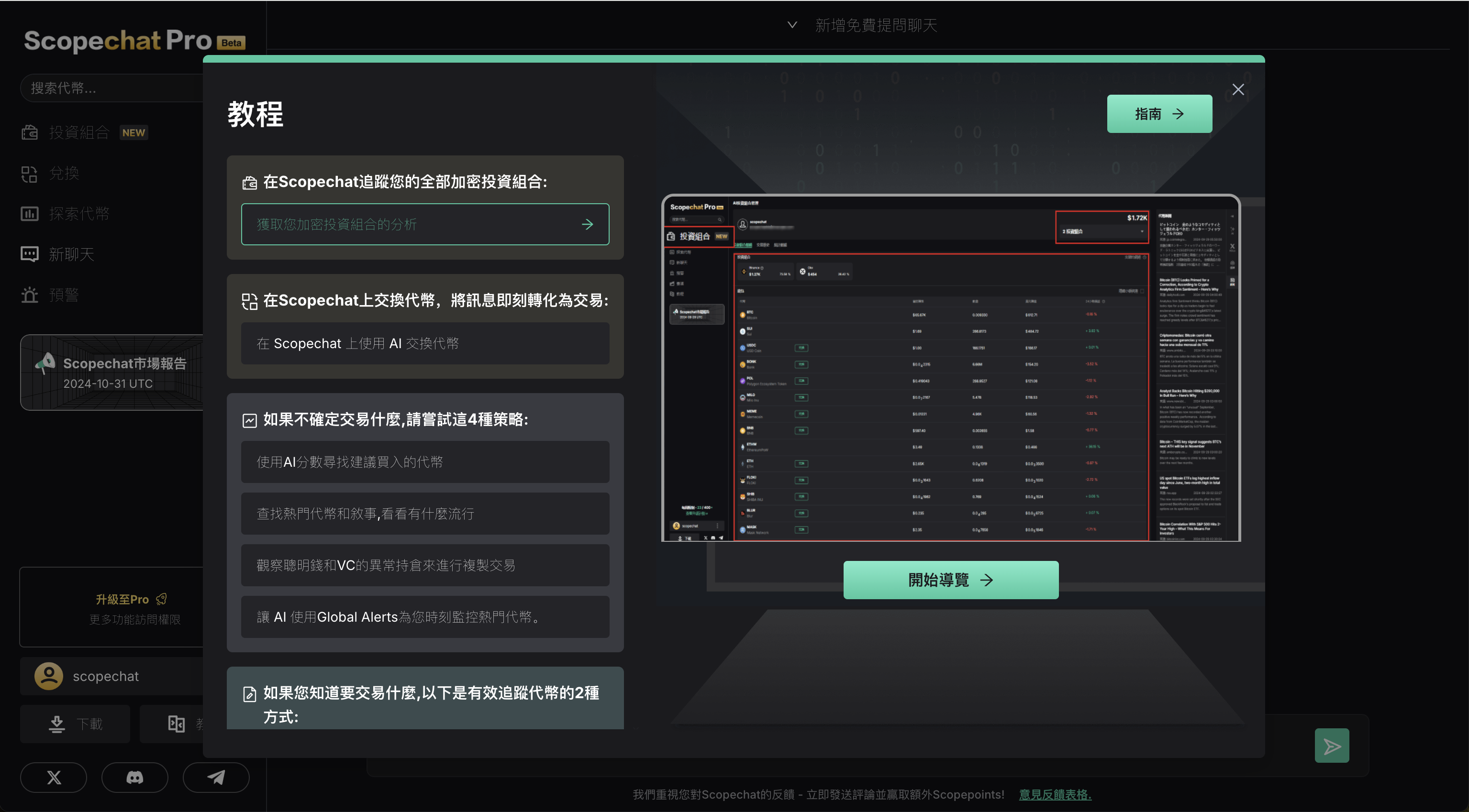 * 有特定目標代幣的人的指南（2 個Walkthrough） 要開始使用 Scopechat 教程，請點擊菜單面板上的“教程”，選擇您感興趣的主題，然後點擊“Start Walkthrough”啟動視覺指南。